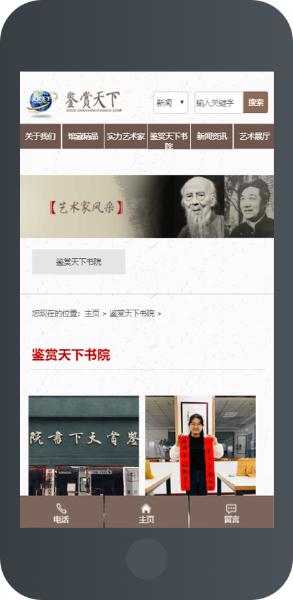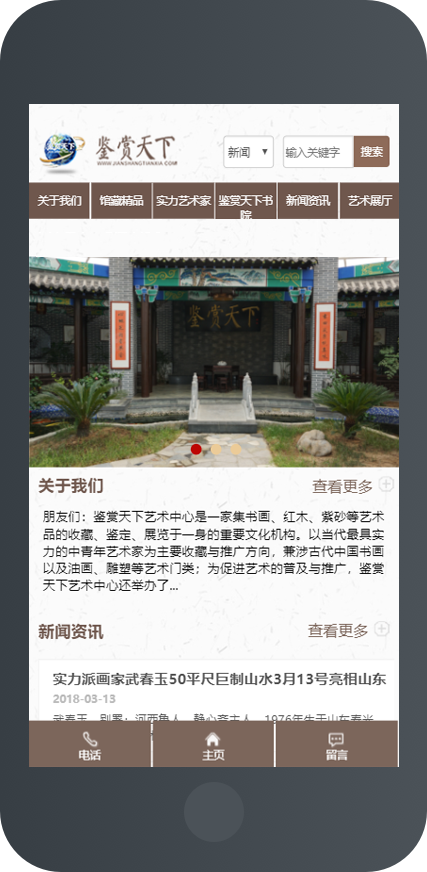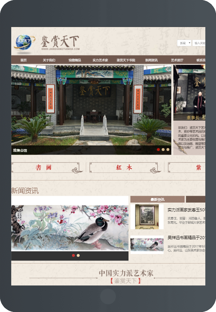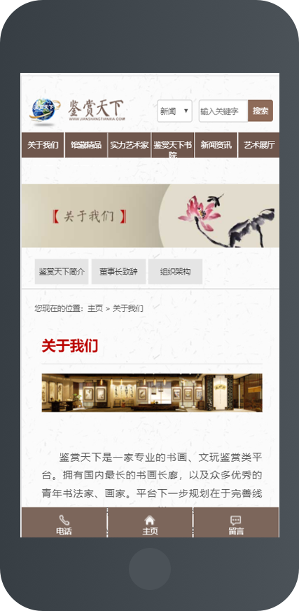 鉴赏天下是一家集国画、书法、馆藏于一体的展示型鉴赏平台,在移动市场设备应用占比非常之大,我们应用HTML5最新互联网开发技术,综合当前移动互联网用户使用习惯,实现页面的响应式布局,适配不同移动设备的不同尺寸。达到满足更多移动用户访问官网习惯,实现跨屏的多应用,提升企业品牌形象及官网的优秀移动互联的体验。