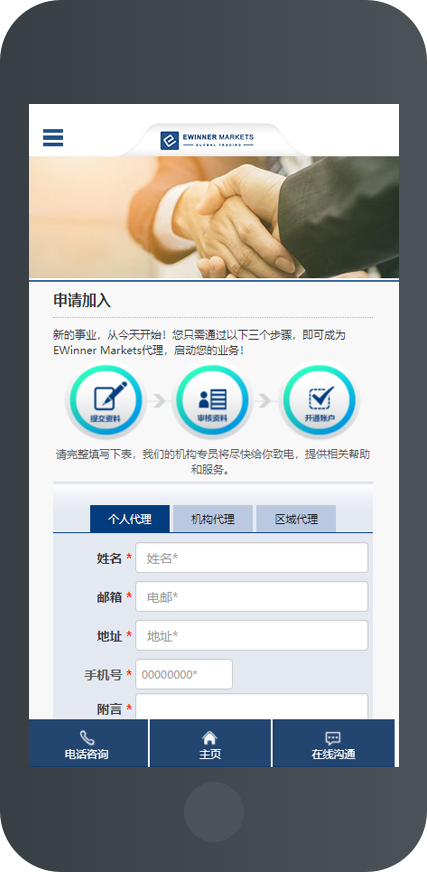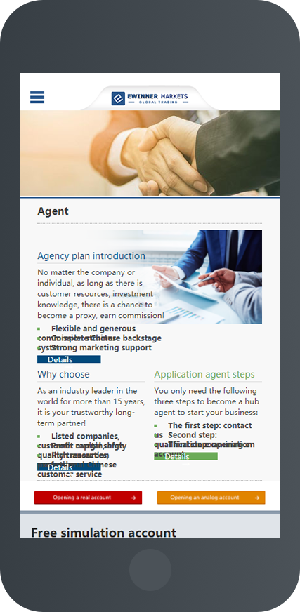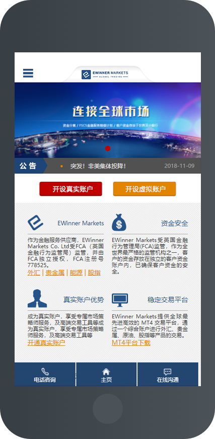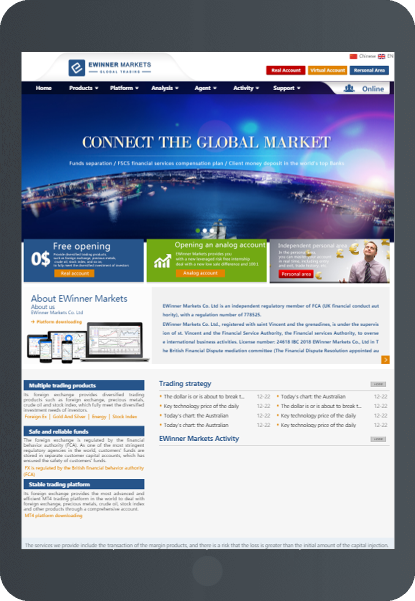 环盛外汇是金融外汇领域,在移动市场设备应用占比非常之大,我们应用HTML5最新互联网开发技术,综合当前移动互联网用户使用习惯,实现页面的响应式布局,适配不同移动设备的不同尺寸。达到满足更多移动用户访问官网习惯,实现跨屏的多应用,提升企业品牌形象及官网的优秀移动互联的体验。