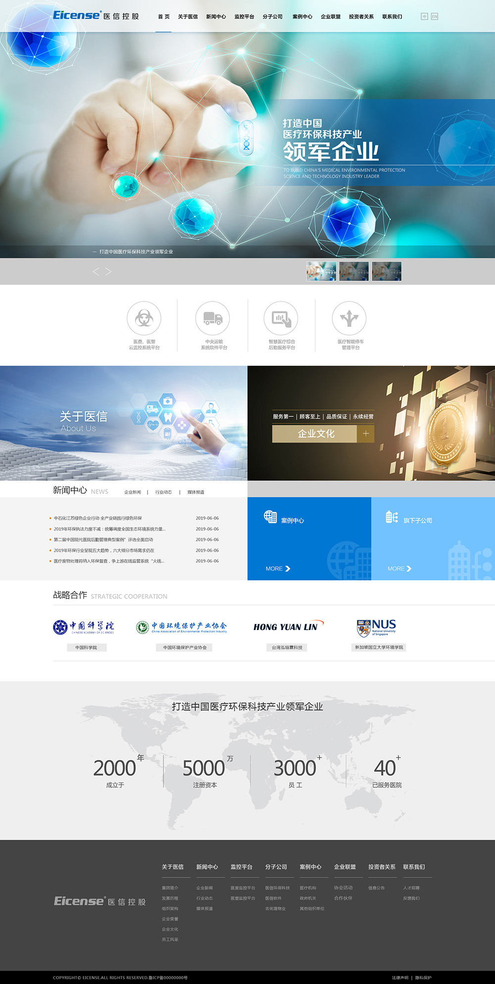集团现有员工3000余人,业务涉及医疗环保产业信息化建设,环保科技专业化运营服务,计算机软硬件的技术开发推广、环保清洁产品的销售等,现业务区域已覆盖山东省内三十多家龙头医院。