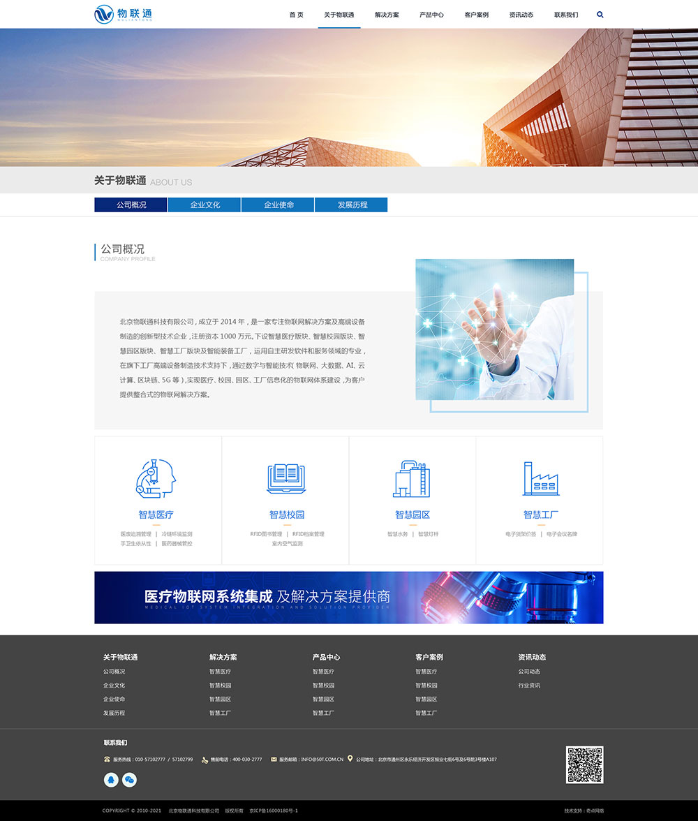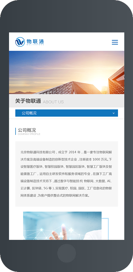 北京物联通科技有限公司,成立于2014年,是一家专注物联网解决方案及高端设备制造的创新型技术企业,注册资本1000万元。下设智慧医疗版块、智慧校园版块、智慧园区版块、智慧工厂版块及智能装备工厂,运用自主研发软件和服务领域的专业, 在旗下工厂高端设备制造技术支持下,通过数字与智能技术(物联网、大数据、AI、云计算、区块链、5G等),实现医疗、校园、园区、工厂信息化的物联网体系建设,为客户提供整合式的物联网解决方案。