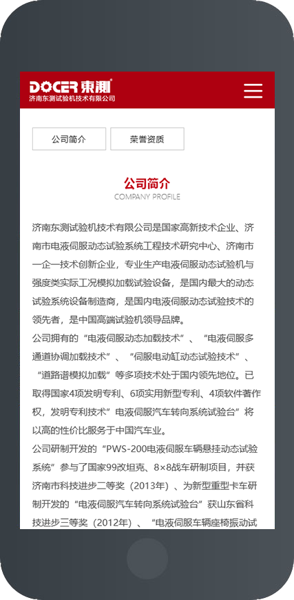 济南东测试验机技术有限公司是国家高新技术企业、济南市电液伺服动态试验系统工程技术研究中心、济南市一企一技术创新企业,专业生产电液伺服动态试验机与强度类实际工况模拟加载试验设备,是国内最大的动态试验系统设备制造商,是国内电液伺服动态试验技术的领先者,是中国高端试验机领导品牌。