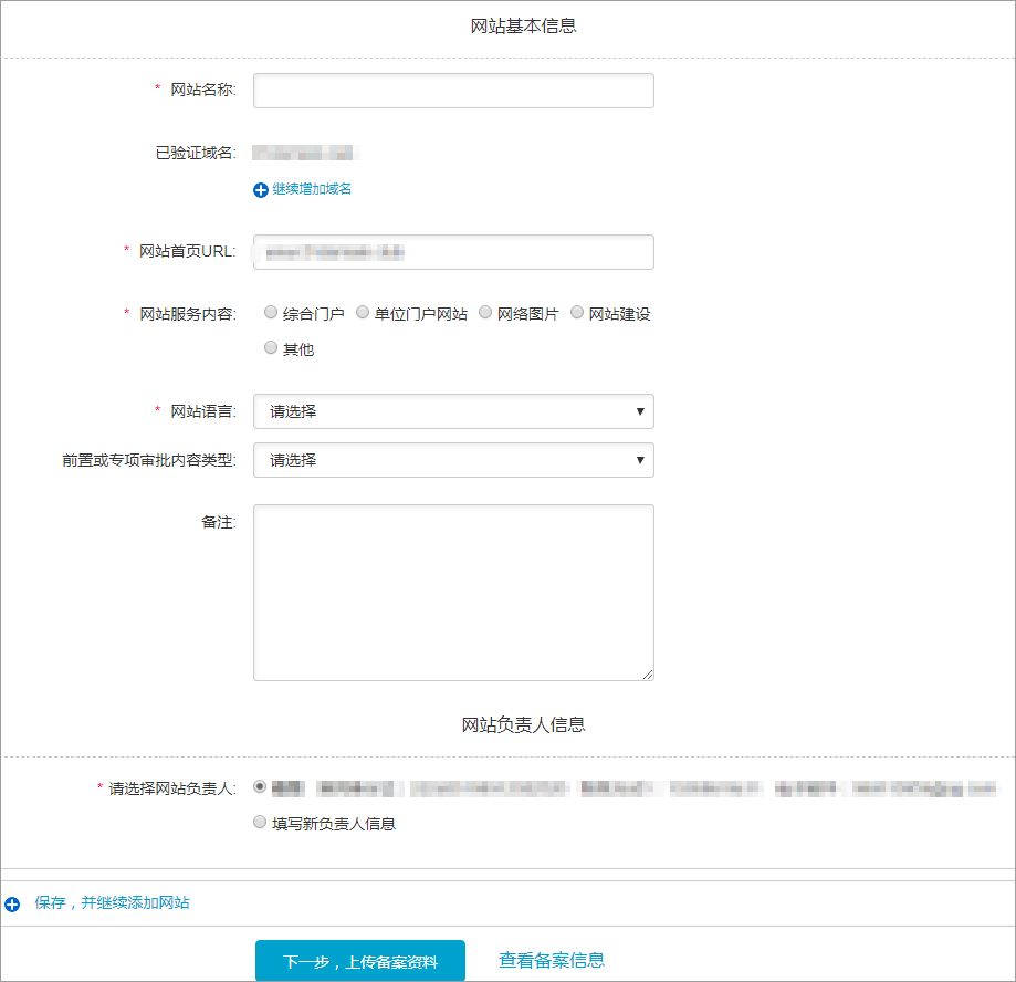 如需备案多个网站,填完网站信息后,单击保存,并继续添加网站。