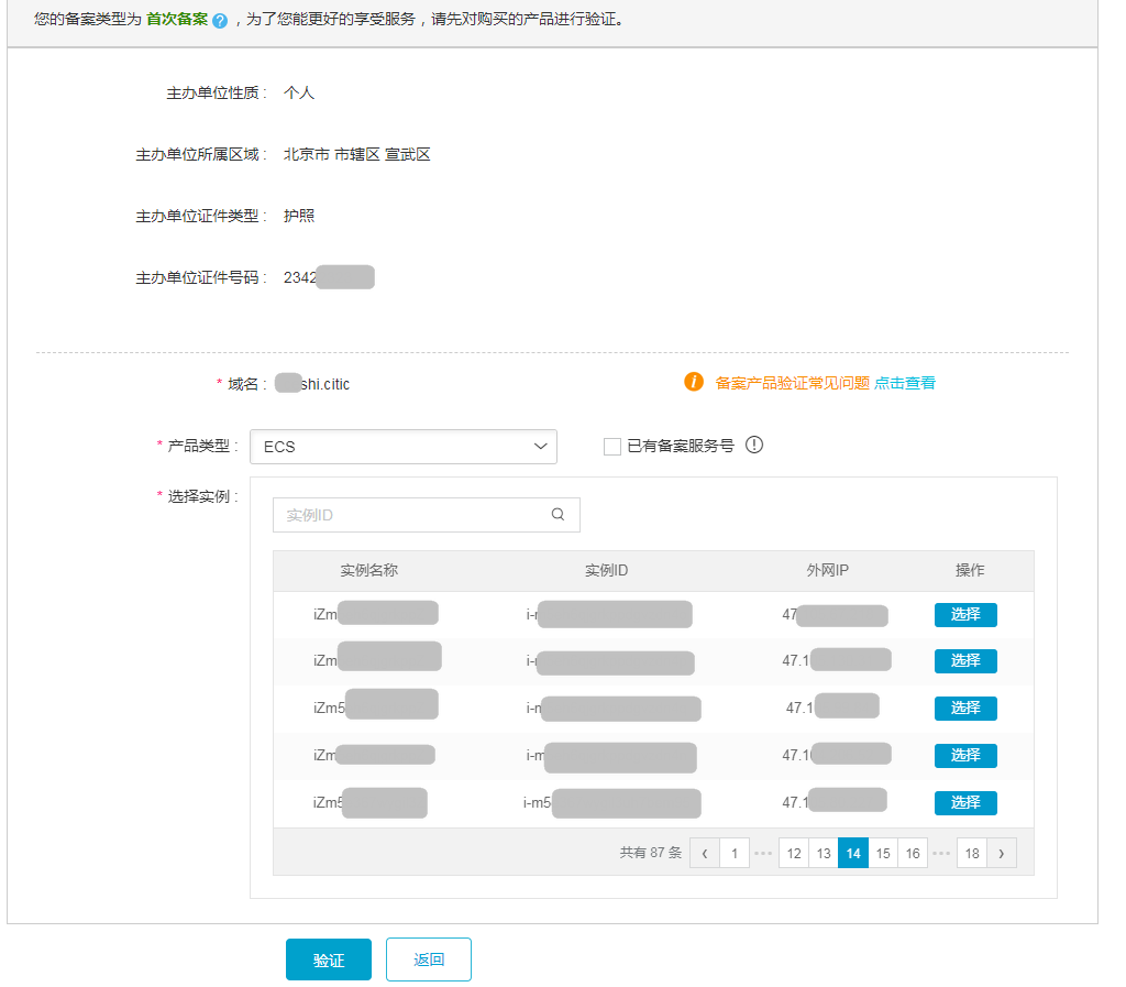 登录阿里云备案系统,填写备案的主体信息和域名,输入验证码后单击验证备案类型。系统会自动为您判断此次备案的类型。